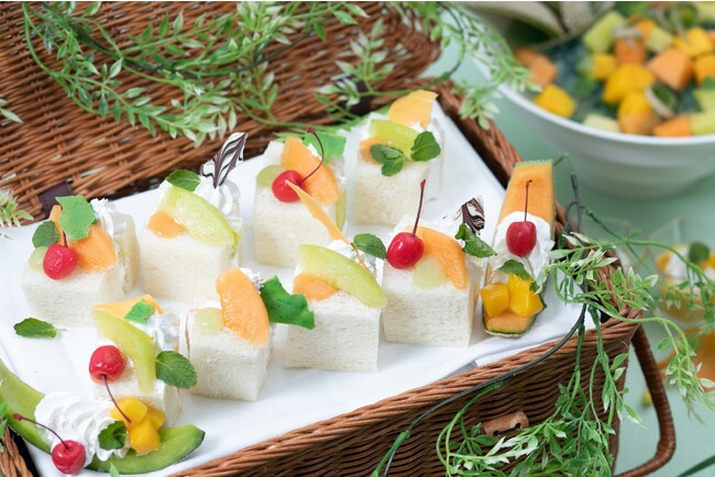 お口直しのお食事では、メロンやマンゴーを使ったフルーツサンドや生ハムとの相性をお楽しみいただける冷製メニューのほか、暑い夏を乗り切るスパイシーなメニューをご用意。ネギ塩ピラフやタンドリーチキン、マンゴーを使ったサルサソースで楽しむローストポークなど、スイーツの甘味とお食事の辛味の両方をお楽しみいただけるスイーツブッフェとなります。
