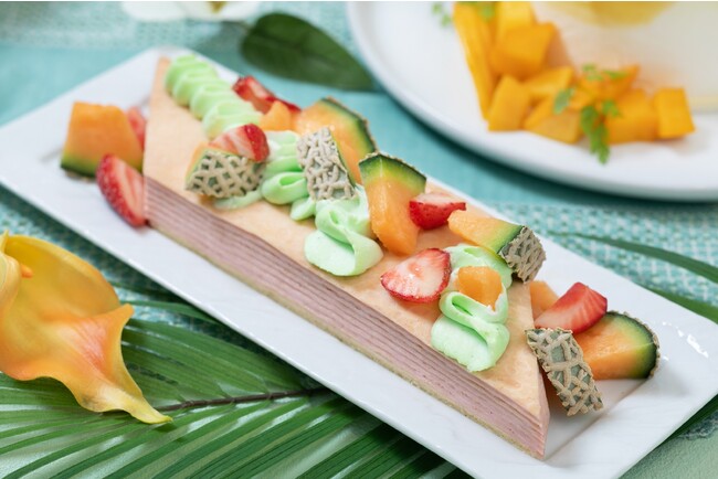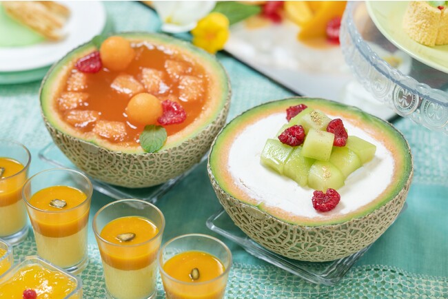 初夏を思わせる爽やかな彩りが特徴のスイーツの中でも、パティシエのおすすめは大ぶりな赤果肉が詰まった“まるごとメロンゼリー”と生クリームとゴロゴロした青果肉が目を引く“まるごとメロンショート”。どちらもメロンを器にしてご提供いたします。マンゴーを使って作ったクリームで仕上げる“モンブラン”はパフォーマンスコーナーで搾りたてをご提供いたします。