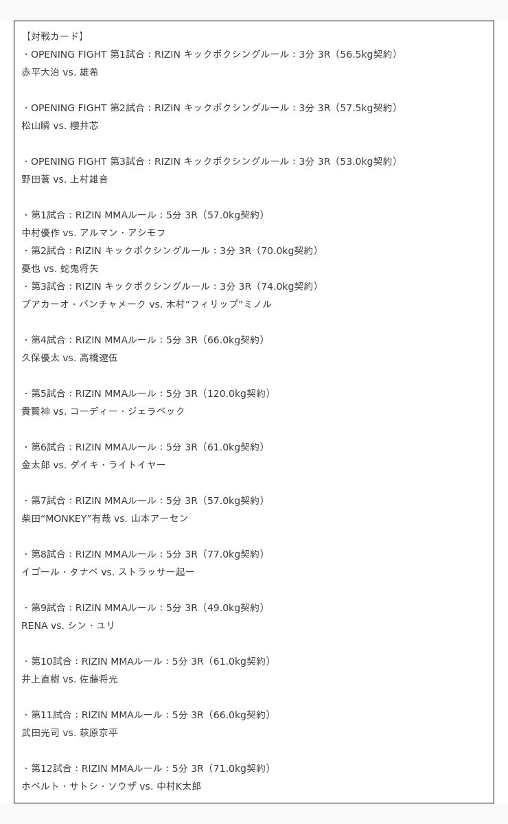 ※対戦カードは直前まで変更の可能性があります。最新カードはRIZINオフィシャルサイトにてご確認ください。