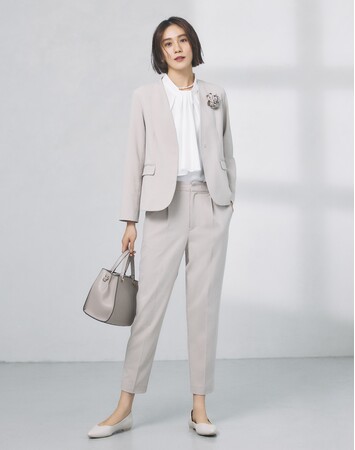 ・洗えるノーカラージャケット ¥7,700(税込) & 美脚テーパードパンツ ¥4,950(税込)