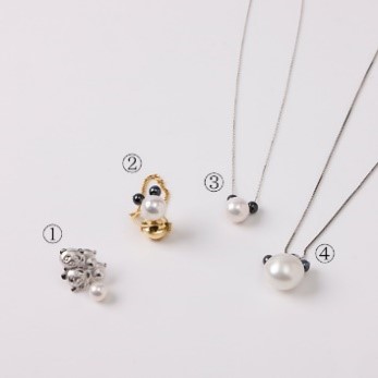 〈大和宝飾〉1.パンダブローチ 18,700円、2.パンダピンブローチ 22,000円、3.アコヤパールパンダペンダント 25,300円、4.白蝶パールパンダペンダント 22,000円/1階イベントスペース
