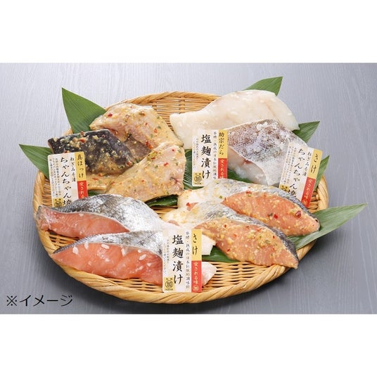 【内容】さけ塩麹漬・さけねぎ味噌漬け・助宗だら塩麹漬 各約80g×2、真ほっけねぎみそ漬約60g×3