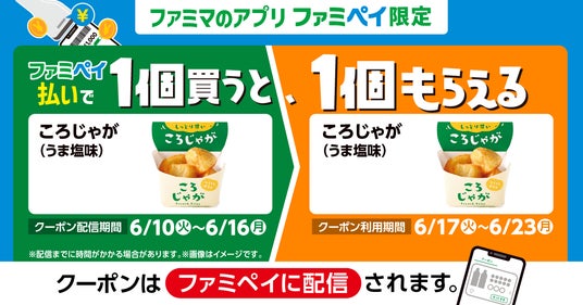 また、ファミマのアプリ「ファミペイ」でも「1個買うと、1個もらえる」キャンペーンを実施し、ファミペイ払いで「ころじゃが」を買うと翌週使える「ころじゃが」の無料引換クーポンが「ファミペイ」内でもらえます。