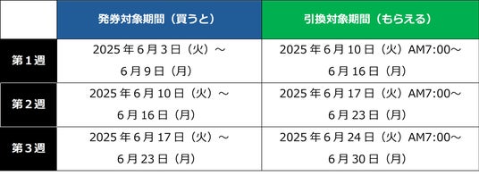 2025年6月3日(火)から6月9日(月)の第1週発券対象期間中に対象商品をご購入された方は、6月10日(火)AM7:00から対象商品の引き換えが可能になります。