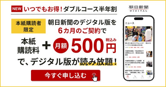 株式会社朝日新聞社(代表取締役社長:角田克)が運営するニュースサイト「朝日新聞デジタル」(https://www.asahi.com/)は、2025年1月15日(水)より、朝日新聞本紙購読者を対象に「ダブルコース半年割」を常設しました。「ダブルコース半年割」は、これまでキャンペーン時期だけ申し込みが可能だった「キャンペーン・ダブルコース」<本紙購読料+500円(税込み)>の名称を変更したもので、いつでもお申し込みいただけるようになりました。