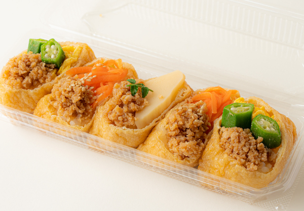 お子様から大人まで人気の鶏そぼろをいなり寿司と組み合わせしました。人参やオクラ、たけのこをあわせて、見た目も食感も楽しめます。