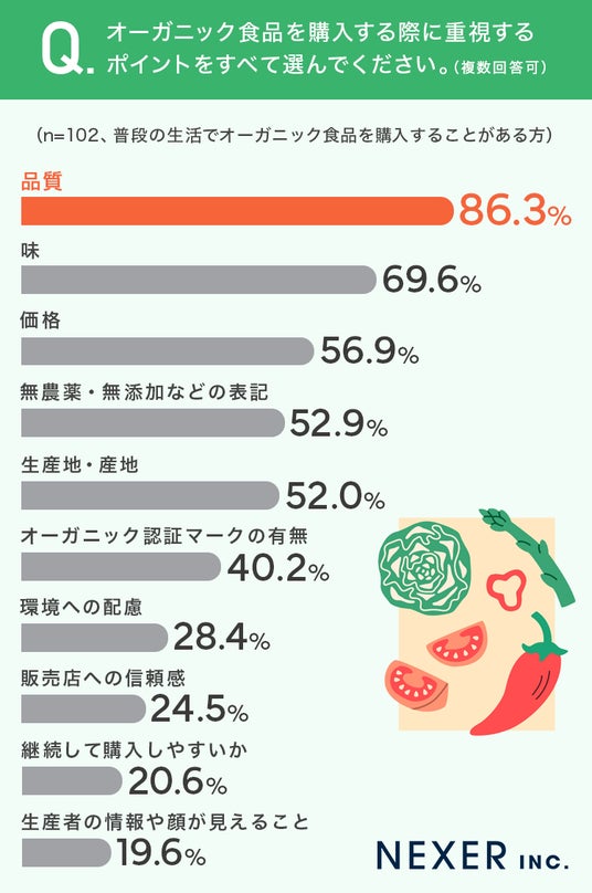 オーガニック食品を購入する方の86.3%が「品質重視」と回答しています。