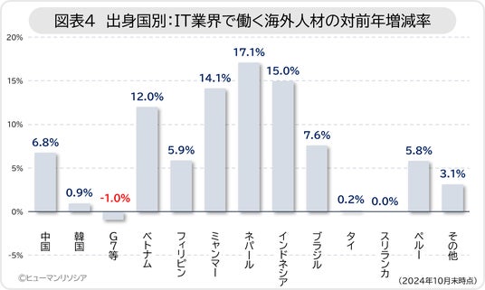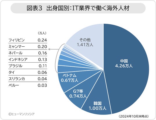 また、人数としては少ないものの、ネパール、インドネシア、ミャンマー出身者が大きく増えており、「その他」の国出身者が1.41万人で全体の15.6%を占めるなど、IT業界で働く海外人材の特徴として、出身国が多様であることがあげられます(図表3、4)。
