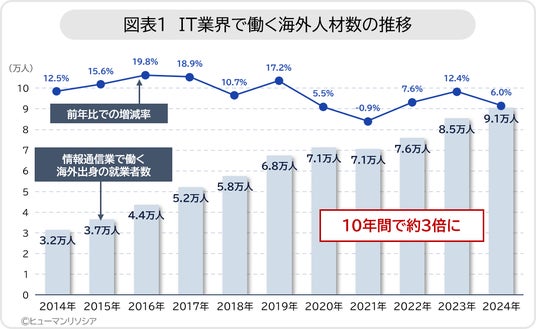 日本のIT業界(情報通信業)で働く海外人材は、2024年10月末時点で9.1万人と、10年間で約3倍に増えています。2014年より対前年で2桁増が続き、コロナ禍では一時的に停滞した後、2023年には前年比で12.4%増となりましたが、2024年は前年比で6.0%増と、伸び率はやや停滞しています(図表1)。