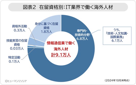 在留資格別では、「専門的・技術的分野」での就業が6.8万人と、海外人材の約75%を占めています。そのうち約9割の6.1万人が、いわゆるホワイトカラー職種である「技術・人文知識・国際業務」の在留資格で就業していることから、IT業界で働く海外人材は、ITエンジニアなどの高度人材が中心であると言えます(図表2)。