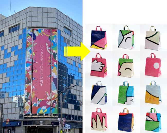 2回目となる今回は、昨年11月に使用した屋外広告幕をエコバッグに作り変えて、店頭にて販売いたします。エコバッグを製作し、お客様にご購入・ご使用いただくことで、レジ袋(プラ)の削減と焼却処分時のCO2削減につなげることを狙いとしています。