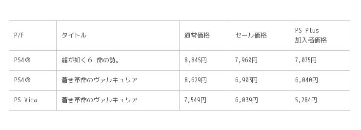 今回、PS Store にて割引が実施されるのは、シリーズ累計出荷数 900 万本を超える人気シリーズ最新作『龍が如く6 命の詩。』、そして“ヴァルキュリア”プロジェクト完全新作の RPG タイトル『蒼き革命のヴァルキュリア』です。また、PlayStation(R)Plus 加入者は、セール価格からさらに 10%割引となります。