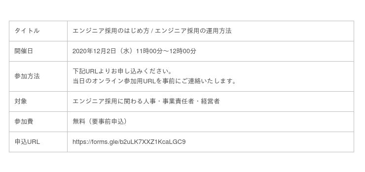 株式会社エイチームのグループ会社であるIncrements株式会社(本社:東京都港区、代表取締役社長:柴田健介、以下当社)は、株式会社インフラトップ(本社:東京都渋谷区、代表取締役CEO:大島礼頌、以下インフラトップ社)と共同で、2020年12月2日(水)に無料オンラインセミナー「エンジニア採用のはじめ方 / エンジニア採用の運用方法」を開催いたします。