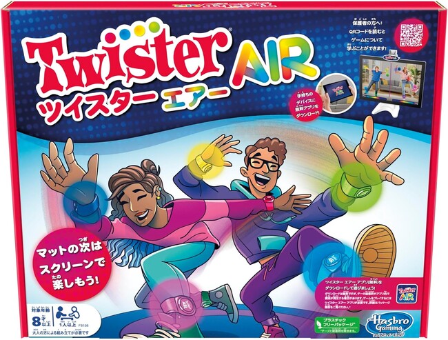 マットではなく、アプリを通してスクリーン*で遊べるツイスターゲーム。2人対戦やチーム対戦、1人でも遊べる商品。リストバントとアンクルバンドをつけて画面上に表示される丸に合わせて手足を伸ばしたり、面白いポーズをとると、ポイントが加算されるゲームになります。