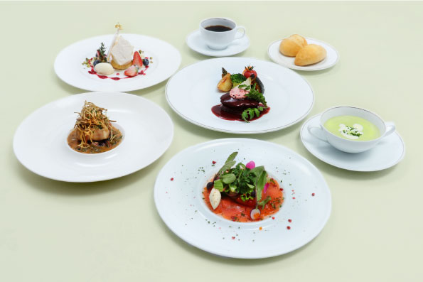 ホテルが位置する信州・軽井沢は標高約1,000m、どの季節も美しい自然に囲まれ、特に新緑の季節となる5月~7月は、とても心地よく、爽やかな時間をゆっくりと過ごせる場所です。「信州食材 特別フルコースディナー付プラン」では、新緑に臨むレストラン『コンチネンタルルーム』の特別ディナーをご用意しており、昆布締めにした大鱒にさっぱりした酸味のある安曇野産山葵ソースで仕上げた前菜「大鱒のカルパッチョ」をはじめ、地元の野菜・山菜を使用した「ポタージュスープ」や「鰆のポワレ」、メイン料理には信州牛のフィレ肉のポワレに桔梗ヶ原メルローワインのソースを合わせ芳醇な味わいに仕上げた一品を堪能いただけます。コースの最後はデザートの信州産ベリーとマスカルポーネチーズのムースで締めくくり、軽井沢の豊かな恵みをお楽しみいただけます。