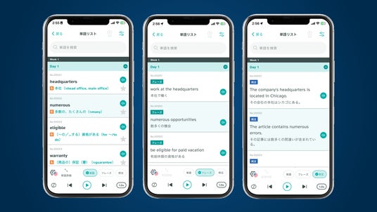 書籍とチャンツで音から入り、意味を理解し、フレーズで基本の使い方を押さえる。さらにアプリで、書籍にない例文を通して理解を広げ、クイズや復習機能で定着へとつなげる。単語・音声・フレーズ・例文・復習が分断されず、一つの流れとしてつながっていること、それが「やった分だけ身に付く」実感を支える設計になっています。