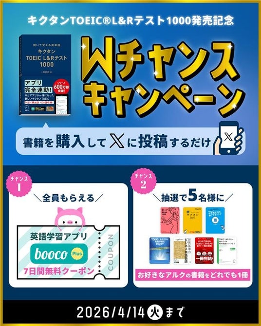 本キャンペーンでは、対象条件を満たした方全員に、英語学習アプリ「booco」の有料プラン「booco Plus」を1週間無料でご利用いただけるクーポンをプレゼント。さらに、応募者の中から抽選で5名様に、アルクの書籍の中からお好きな1冊をプレゼントいたします。