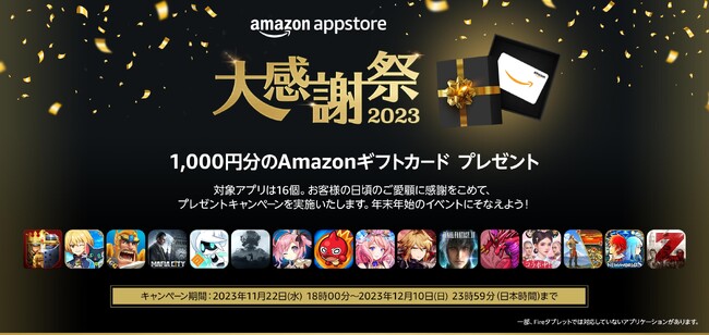 Amazonアプリストア 大感謝祭2023では、2023年11月22日(水)18時00分~2023年12月10日(日)23時59分(日本時間)の期間中に計16の対象アプリにて、合計10,000円相当以上利用した方へ、1,000円分のAmazonギフトカードをプレゼントいたします*1。キャンペーンの詳細は、こちら( https://www.amazon.co.jp/tg2023 )からご覧ください。