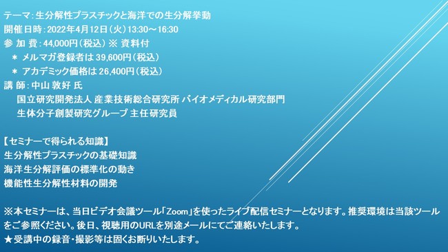 先端技術情報や市場情報を提供している(株)シーエムシー・リサーチ(千代田区神田錦町: https://cmcre.com/ )では、 各種材料・化学品などの市場動向・技術動向のセミナーや書籍発行を行っておりますが、 このたび「生分解性プラスチックと海洋での生分解挙動」と題するセミナーを、 講師に中山 敦好 氏 国立研究開発法人 産業技術総合研究所 バイオメディカル研究部門 生体分子創製研究グループ 主任研究員)をお迎えし、2022年4月12日(火)13:30より、 ZOOMを利用したライブ配信で開催いたします。 受講料は、 一般:44,000円(税込)、 弊社メルマガ会員:39,600円(税込)、 アカデミック価格は26,400円(税込)となっております(資料付)。