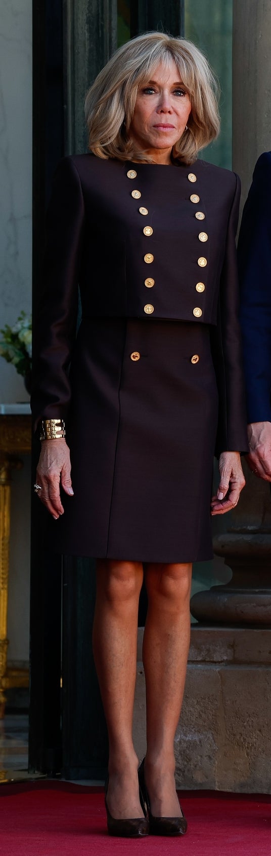 ブリジット・マクロン仏大統領夫人は、ブラウンのショートウールとミカドシルクのダブルブレストジャケットとスカートを着用しました。