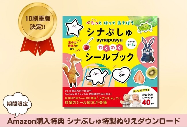 株式会社世界文化社は、テレビ東京の赤ちゃん向け人気番組「シナぷしゅ」のシールブック『シナぷしゅ わくわくシールブック』の10刷重版を決定致しました。また、10刷重版を記念し、Amazonで購入していただいた方には期間限定で「シナぷしゅ」特製ぬりえがダウンロードできる特典を付与致します。