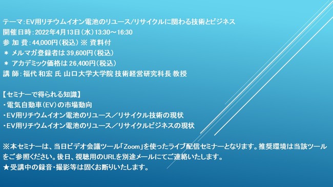 先端技術情報や市場情報を提供している(株)シーエムシー・リサーチ(千代田区神田錦町: https://cmcre.com/ )では、 各種材料・化学品などの市場動向・技術動向のセミナーや書籍発行を行っておりますが、 このたび「EV用リチウムイオン電池のリユース/リサイクルに関わる技術とビジネス」と題するセミナーを、 講師に福代 和宏 氏 山口大学大学院 技術経営研究科長 教授)をお迎えし、2022年4月13日(水)13:30より、 ZOOMを利用したライブ配信で開催いたします。 受講料は、 一般:44,000円(税込)、 弊社メルマガ会員:39,600円(税込)、 アカデミック価格は26,400円(税込)となっております(資料付)。