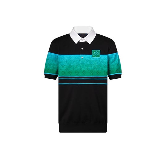 柔らかなブラックのコットンニットにシックなひねりを加えたラグビーシャツ。鮮やかなジャカード織りの水平バンドにはブルーグリーンのグラデーションで描いたモノグラム・モチーフをあしらいました。胸元の「Marque L. Vuitton Deposee」シグネチャーの刺繍入りパッチやマザー・オブ・パール風のボタン、質感のあるコントラストの効いたストライプなどのディテールも魅力。