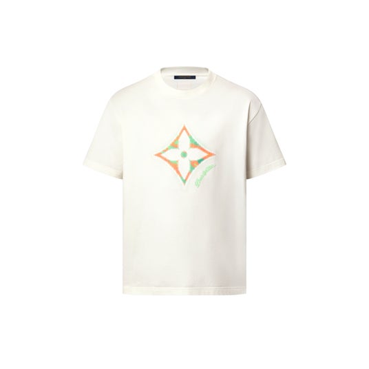 3Dプリントの鮮やかなモノグラム・フラワーや手描き風の「Louis Vuitton」シグネチャーで胸元を彩った、定番のホワイトTシャツ。背面に「Marque L. Vuitton Deposee」のラベルが施された印象的な1着は他のアイテムとのミックス & マッチも楽しめます。