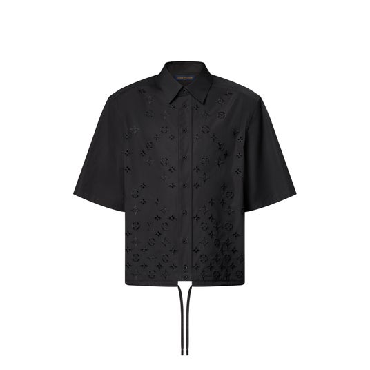 ドローストリングウエストと刺繍でプレイフルなひねりを加えたシャツ。なめらかなコットンポプリンにエレガントなグラデーション効果でモノグラム・フラワーのアングレーズ刺繍とさりげなくLV シグネチャーをあしらい、背面には「Marque L. Vuitton Deposee」のパッチを配しました。