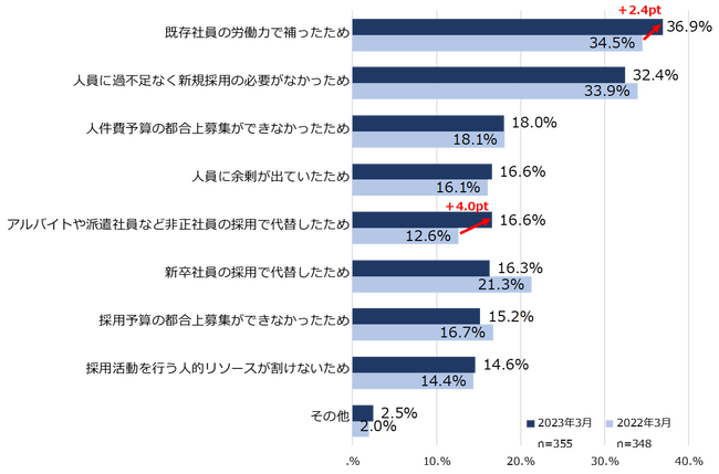 23年3月に中途採用活動を実施した企業は全体で43.5%と前年同月比+1.4ptの微増となった。従業員規模別に見ると、「50名以下(29.8%)」で前年同月比+2.4pt、「51~300名以下(50.8%)」では前年同月比+5.0pt、「301名以上(53.6%)」の大企業では前年同月比-1.9ptとなった。中途採用を行わなかった大企業に対してその理由を聞いたところ、「アルバイトや派遣社員など非正社員の採用で代替したため(16.6%、前年比+4.0pt)」、「既存社員の労働力で補ったため(36.9%、前年比+2.4pt)」の項目で前年比での増加幅が大きかった。【図1、2】