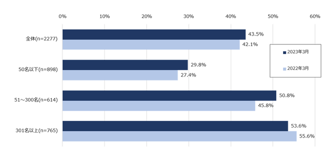 中途採用活動実施率は43.5%で前年同月比+1.4ptと微増。大企業の実施率は微減し、既存社員の労働や非正規社員の採用で労働力・人員を補填する割合が増加【図1、2】