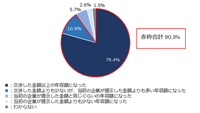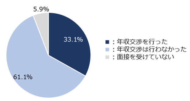 直近3カ月以内の中途入社者で、企業と年収の交渉を行った人は33.1%で、そのうち交渉し、企業が提示していた金額よりも年収が上がった人は90.3%だった。