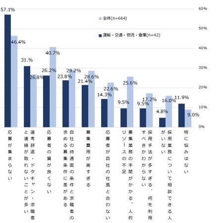 正社員の過不足感について、不足していると感じている企業は58.2%と半数を超えた。業界別では「運輸・交通・物流・倉庫」が70.9%で最も不足を感じている結果となった。「運輸・交通・物流・倉庫」業界の企業に対して募集に関する悩みを聞くと、「応募が集まらない」が全体平均比+10.7pt の57.1%で最多。迫る“2024年問題※”への対策として、求職者への認知や関心を高める方法の模索や給与・休日水準の底上げなど、抜本的な改善が業界全体として期待される。【図3、4】