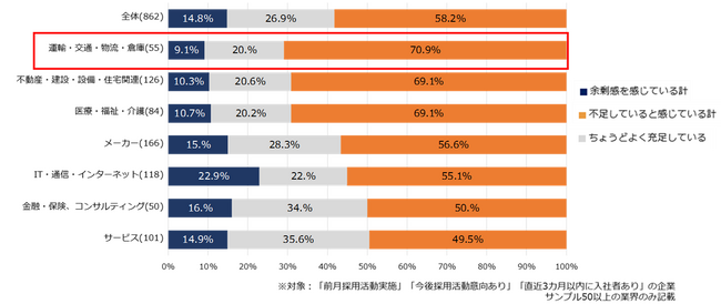 企業の正社員不足感は全体で58.2%と半数を超える結果に。特に運輸・交通・物流・倉庫(70.9%)では人材不足がうかがえ、応募者集めが課題に【図3、4】