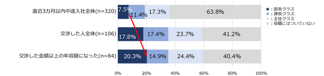 役職別で見ると、「直近3カ月以内で中途入社した部長クラス」の割合は7.5%なのに対し、「交渉した金額以上の年収額になった部長クラス」の割合は20.8%となり、部長クラスで構成比が大きく上昇した。【図5、6、7】