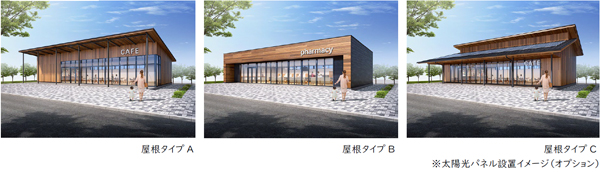本商品は、当社の主軸商品として事務所や店舗などの用途で多数の実績を持つ「ダイワステップ」の新たなラインナップで、標準仕様として外壁、軒天を自然素材である国産材杉板貼としています。国産材や地域産材の活用は、輸入材と比較して輸送時のエネルギー消費を抑えることができCO2の削減につながります。また木材を有効利用することで「植える、育てる、収穫する」というサイクルがうまく循環し森林維持にも貢献できます。建物前面には開放的な連窓サッシを設けたほか、屋根形状も3タイプから選べ、外壁については窯業系サイディング、角波サイディングにも対応が可能で、お客様のご要望に沿った建築が計画できます。