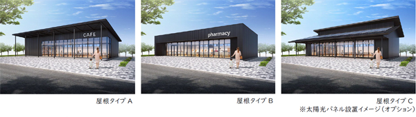 屋根形状:1.タイプA(片流れ屋根)2.タイプB(三方立ち上げ屋根)3.タイプC(段違い切妻屋根)