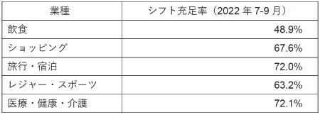 ・今回集計・分析した全5業種でシフトは不足しており、特に飲食業の充足率は他業種に比べて低い