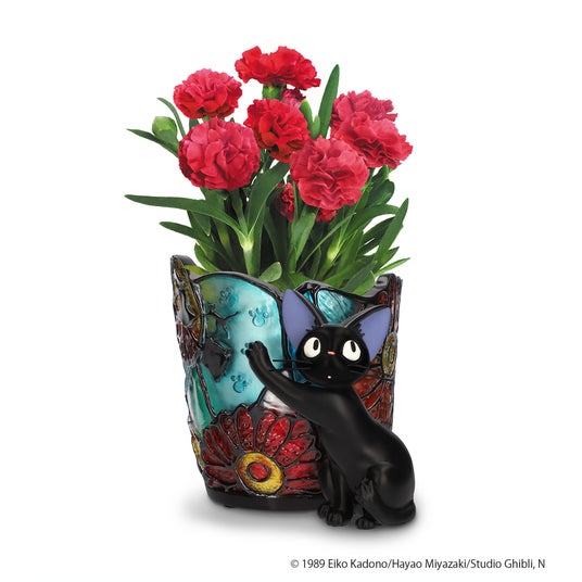 ポリエステル樹脂を用いてステンドグラスの透明感を再現し、「魔女の宅急便」の作中で登場する看板のマークや猫の足跡、カラフルなガーベラのデザインを落とし込んだジオラマボックスと生花のカーネーションのセットです。じっと視線を向けるジジの様子を、リアルに表現しています。