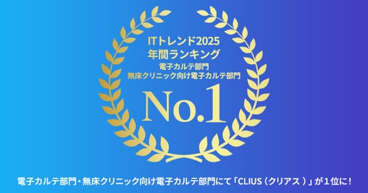 株式会社DONUTS(東京都渋谷区、代表取締役:西村啓成)が提供するクラウド型電子カルテ「CLIUS(クリアス)」は、累計4,000万人以上が利用する、法人向けIT製品の比較・検討サイト「ITトレンド」が公開した「ITトレンド年間ランキング2025」の電子カルテ部門、および無床クリニック向け電子カルテ部門で、1位を獲得したことをお知らせいたします。