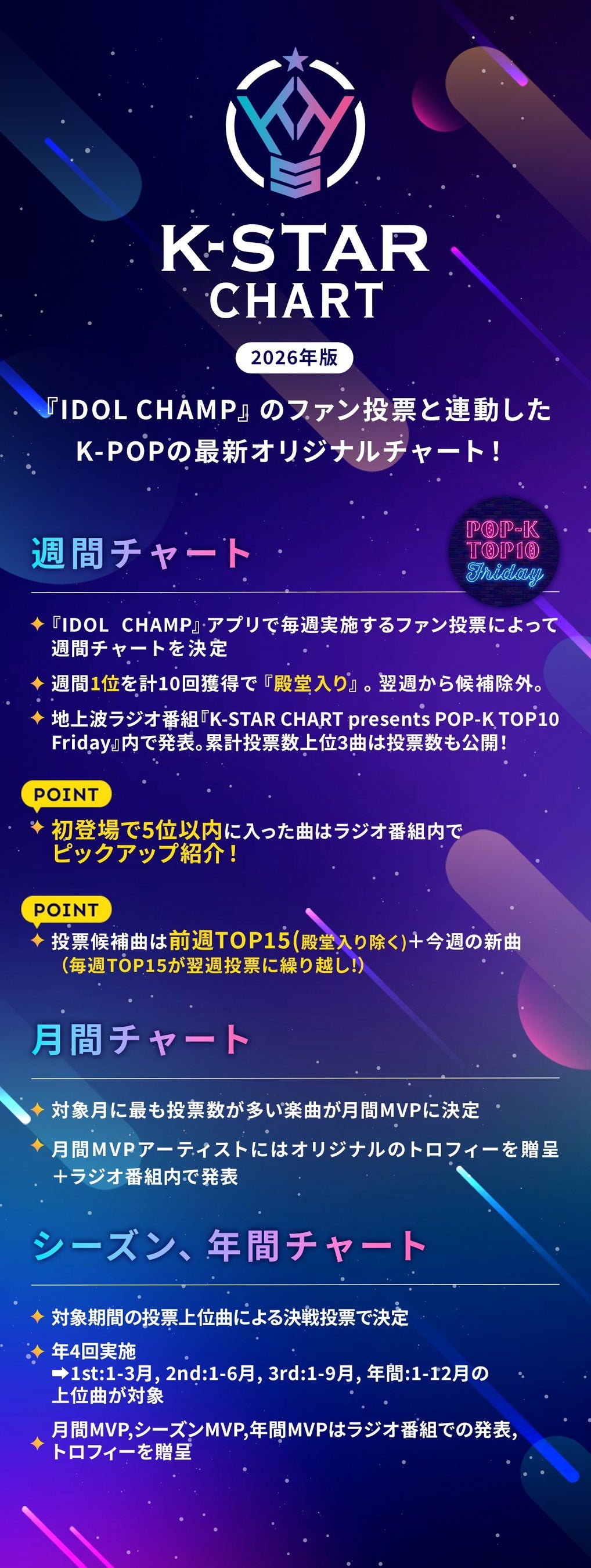 2026年より、『K-STAR CHART』のランキング選定方法が新しくなります。 より熱い応援をアーティストに届けるため、以下の通りルールが変更となりますのでご確認ください。