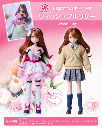 「大崎 甜花」にはアルストロメリアの白とピンクを基調にし、ボリューム感のあるスカートとリボンが散りばめられた可愛らしい衣装の「ウィッシュフルリリー(衣装名)」とブラウンの「制服」が付属しています。