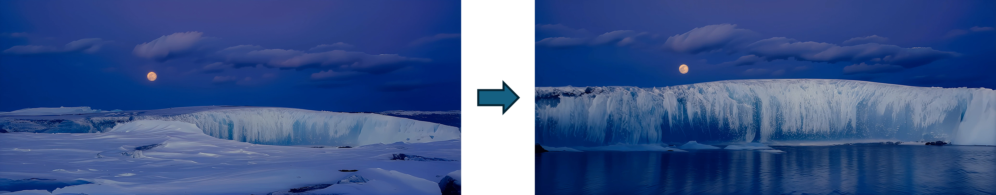 「Meet Japan!(R)」の元画像(左)をAIで拡張し、ドローンが低空飛行するような移動感のある映像(右)を生成