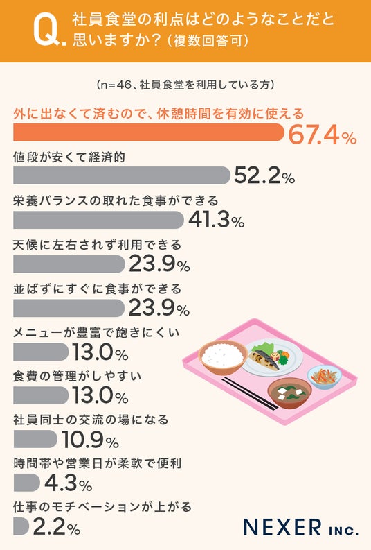 社員食堂を利用している方は、社員食堂のコスパの良さや手軽さ、栄養バランスの良さなどが気に入って利用しているようです。