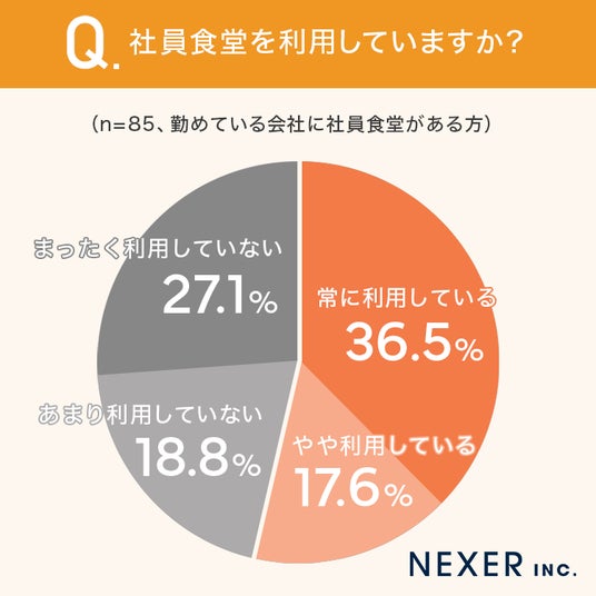今回は、社員食堂の利用に関する調査を行い、その結果について紹介しました。会社に社員食堂があり、「常に利用している」は36.5%、「まったく利用していない」が27.1%と続きました。