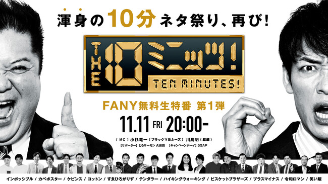 先日発表したFANY大感謝祭 ‟ネタの日“無料生特番として、11月11日(金) に実施する 『THE 10ミニッツ!』に、インポッシブル、すゑひろがりず、テンダラー、ハイキングウォーキング、プラス・マイナス、笑い飯の参戦が決定致しました。