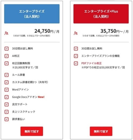 法人向けプランは30日間、個人向けプラン、API連携プランは14日間の無料トライアルを実施しています。今後も文章校正や情報発信にかかわる業務効率改善、誤植や不適切表現に起因するブランド毀損や炎上などのリスクマネジメントに貢献するため、さらなる機能・サービスの向上に取り組んでまいります。