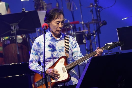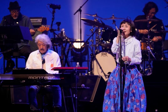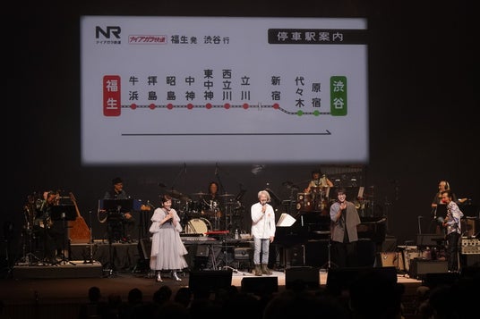 ゲストのシンガー・ソングライター、川崎鷹也と再び鈴木茂をステージに呼び込み、渡辺満里奈とともに賑やかに展開されたのが「FUSSA STRUT」。〈福生行きの切符買って〉〈お守りに&ニーリモマオ〉のコール&レスポンスに加え、50周年ライブでは福生から渋谷までの駅名を観客にコールさせるところが愉快で、ナイアガラっぽい。1977年に「ザ・ファースト・ナイアガラ・ツアー」がここ渋谷公会堂で行われた際、大滝が福生発の切符をステージからばらまいた演出が、今回のステージで再現されたのも心憎い。