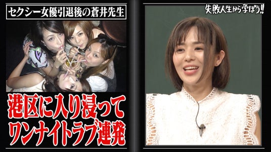 中国での成功を機に、AV引退を決断した蒼井先生。幸せな結婚生活に憧れていた蒼井先生は婚活をスタートしますが、その結果「港区に入り浸ってワンナイトラブ連発」という特大しくじりをやらかしてしまうことに...。「私の人生を振り返ると、これが1番のしくじりです」と語る蒼井先生は、当時の状況について「好きなった人が振り向いてくれないっていうフラストレーションで、全然知らない人とワンナイトラブして(気持ちを)上書きしたかった」と懺悔。「セクシー女優がプライベートで性に奔放になるのはダメと思っていて、現役時代は彼氏以外との体の関係はなかった。引退したらタガが外れて性に奔放になってしまった」と振り返り、「自分が1番なりたくない自分になって大後悔」と打ち明けました。