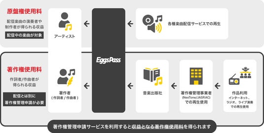 「Eggs Pass」は、アーティストが、Apple Music、Spotify、レコチョクをはじめとする世界170カ国の音楽配信ストアで楽曲の販売を可能とする音楽配信代行サービスです。登録・更新料は0円で、さらに、配信している楽曲の著作権管理を申請することにより著作権使用料を得ることができます。手数料を差し引いた著作権使用料が、著作者(作詞者・作曲者)に還元されます。
